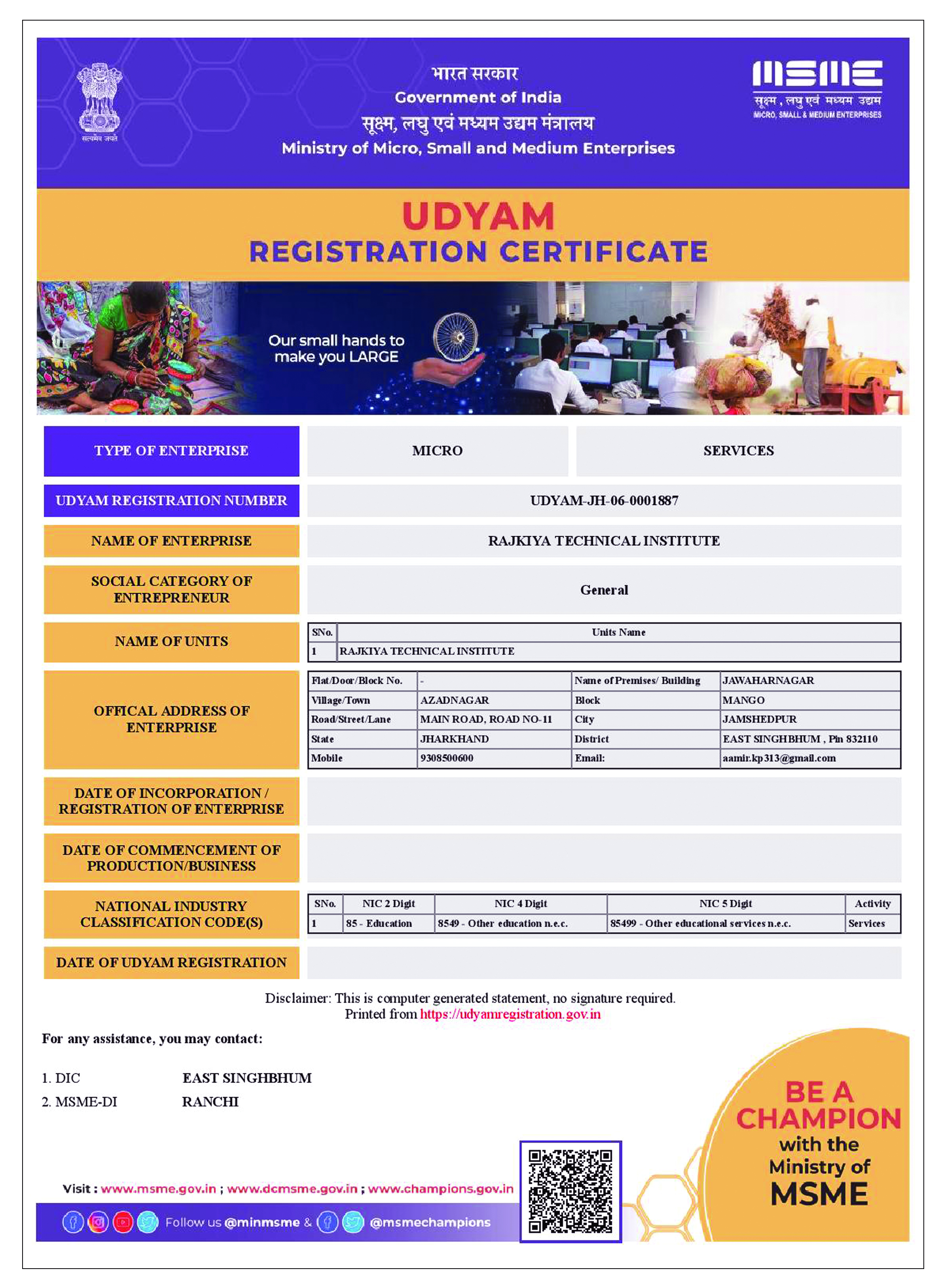 The "Rajkiya Technical Instittute " provide and upgrade education, training and research in fields of technical education, it also helps them to understand the courses, we teach to enhance their technical knowledge which will help them to survive in the modern technical and industrial environment, Further, as a very distinguishing feature of its vision, the institute Rajkiya Technical Instittute to make provisions for the advancement of technical education amongst classes and communities which are educationally backward.